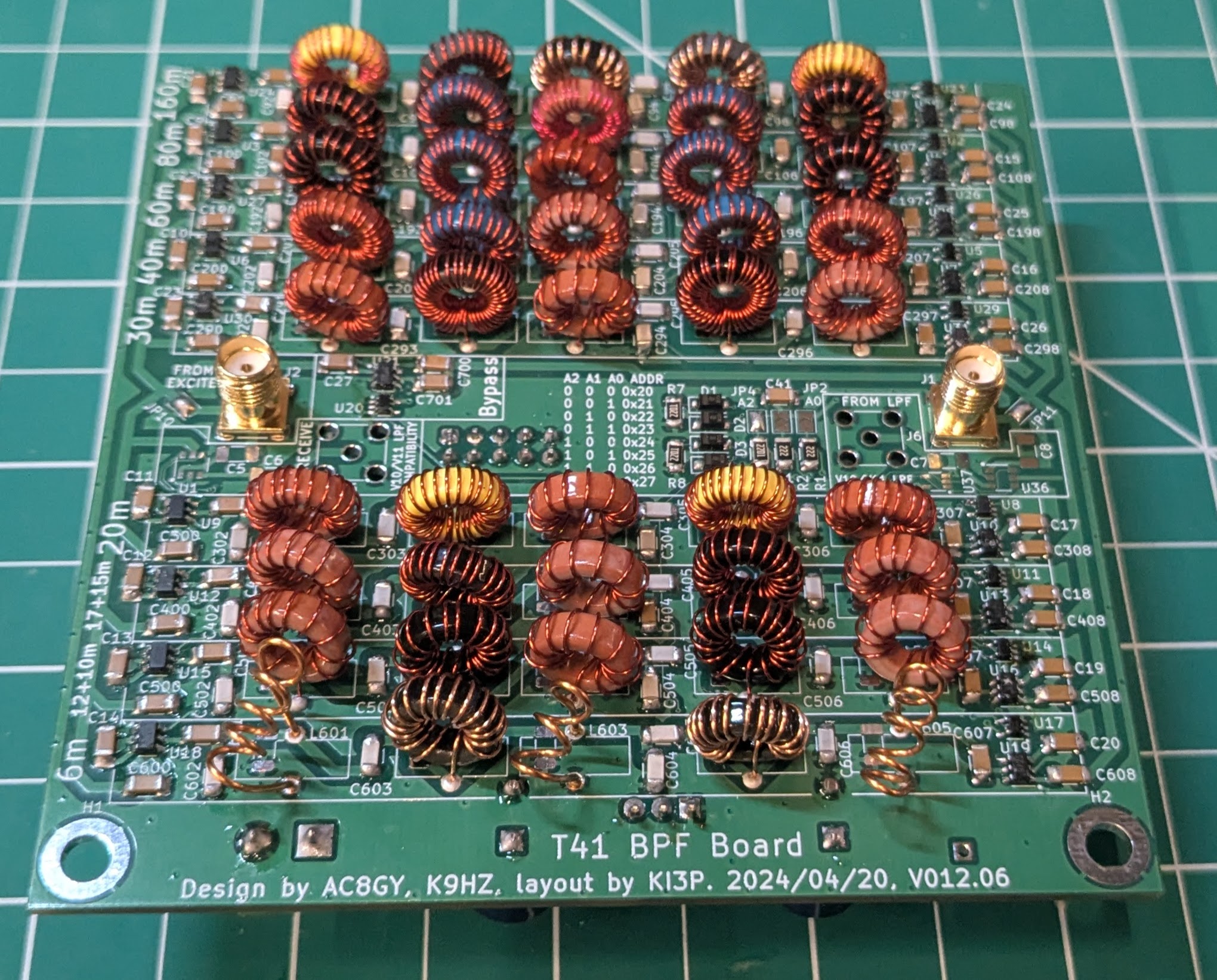 The T41 V12 radio has a bandpass filter board with 9 different filter channels. Each channel has 5 inductors that need to be wound around a toroidal core to achieve the desired inductance. I carefully measured the inductance of each component and tweaked them by hand to get the nicest looking passband I could.
