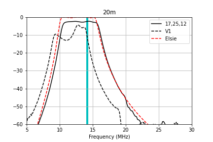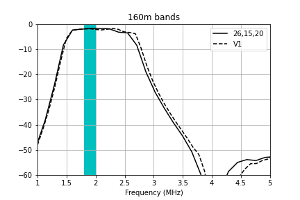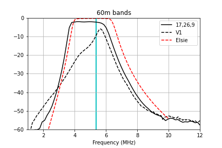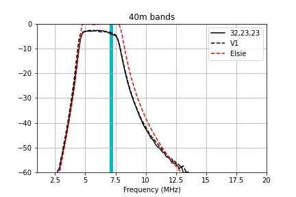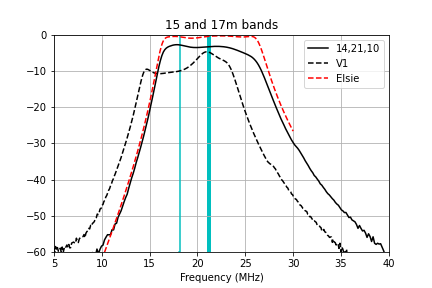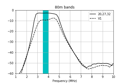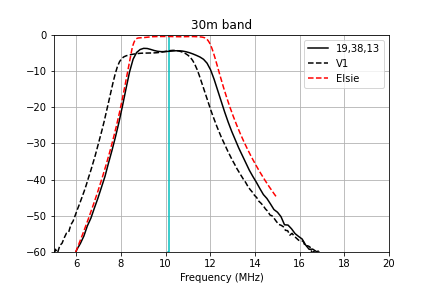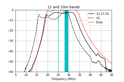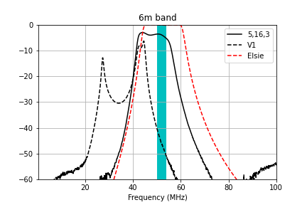 Here are zoomed-in plots that compare the measured transmission to the Elsie simulation and my prior attempt at winding the filters (V1) for each of the bands. The windings specified in the table above give very good performance that matches the Elsie simulations fairly well.