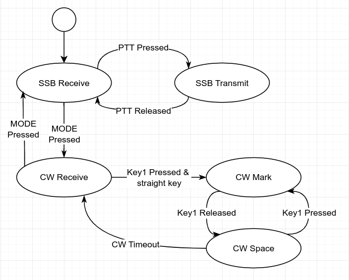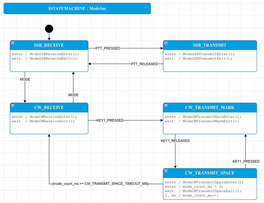 The state machine expects functions called ModeSSBReceiveEnter(), ModeSSBReceiveExit(), etc. to be defined somewhere else. This lets me separate all my radio-specific code from the state machine by placing it in these functions.