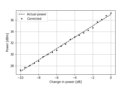 \[\begin{aligned} 36.99 & = 51.34 + e_i \\ \therefore e_i & = 36.99-51.34 \\ & = -14.35 \\ \end{aligned}\]We can repeat this calculation using all the other attenuation values and calculate the average intercept offset. The comparison of the corrected power and the predicted actual power is shown in the plot below: