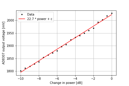 However, that’s not quite right. The AD8307 devices has two errors that need to be compensated for in the calibration process. The first is an error in the slope, which is nominally 25 mV/dB, but can vary from 23 to 27. The second is an error in the offset, which is nominally -84 dBm but can vary from -87 to -77, according to the datasheet. The formula relating the transmission line power to output voltage is actually: