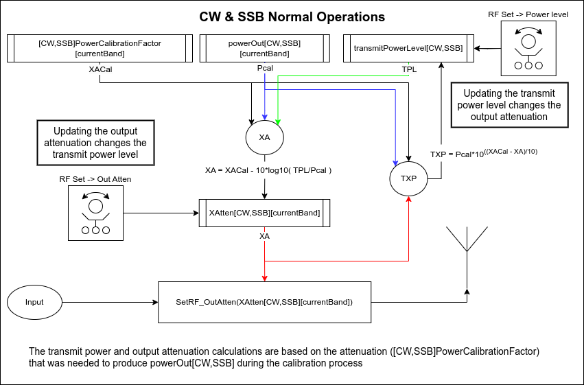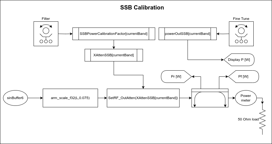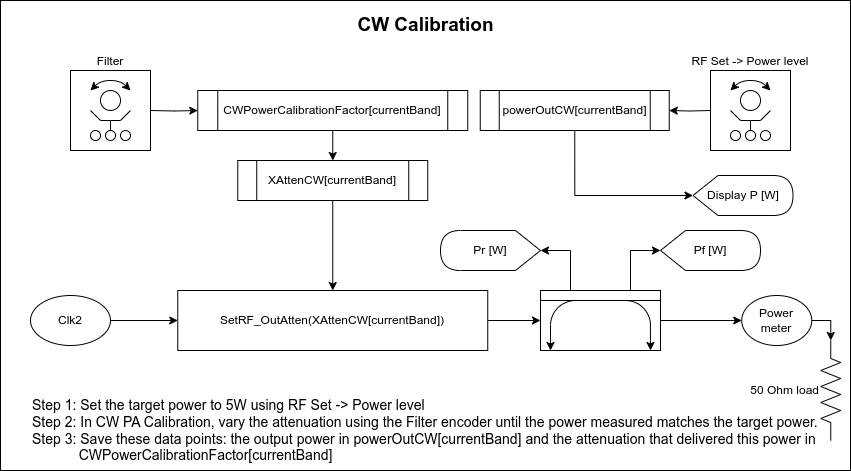 The process is shown in the diagram above: set the calibrated power level using the RF Set -> Power level menu, and save this in the variable powerOutCW[currentBand]. This value should be 5 W to stay in the linear regime of the amplifier.