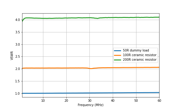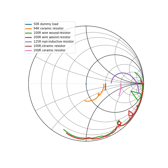 To create an actual resistive load I used these thick film ceramic resistors. These had the expected behavior over the 1 to 60 MHz range.