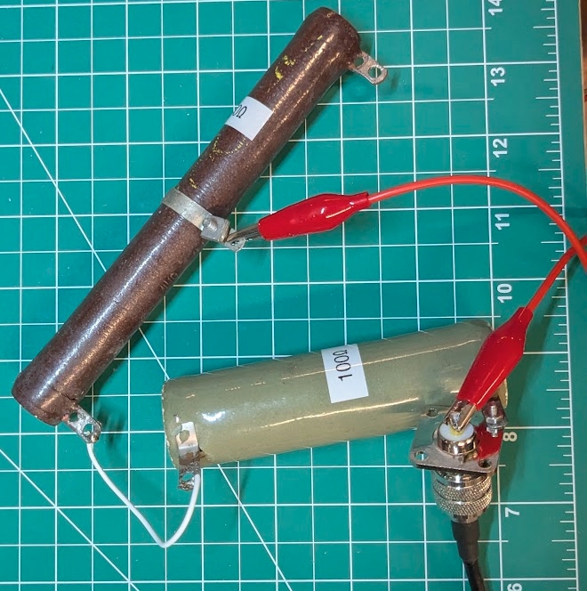 A brief aside on making a good dummy load. For the purposes of this test the dummy load should be purely resistive. You might be tempted to use a resistor like those in the photo below – these are capable of supporting a high power load and can be picked up cheaply at hamfests.