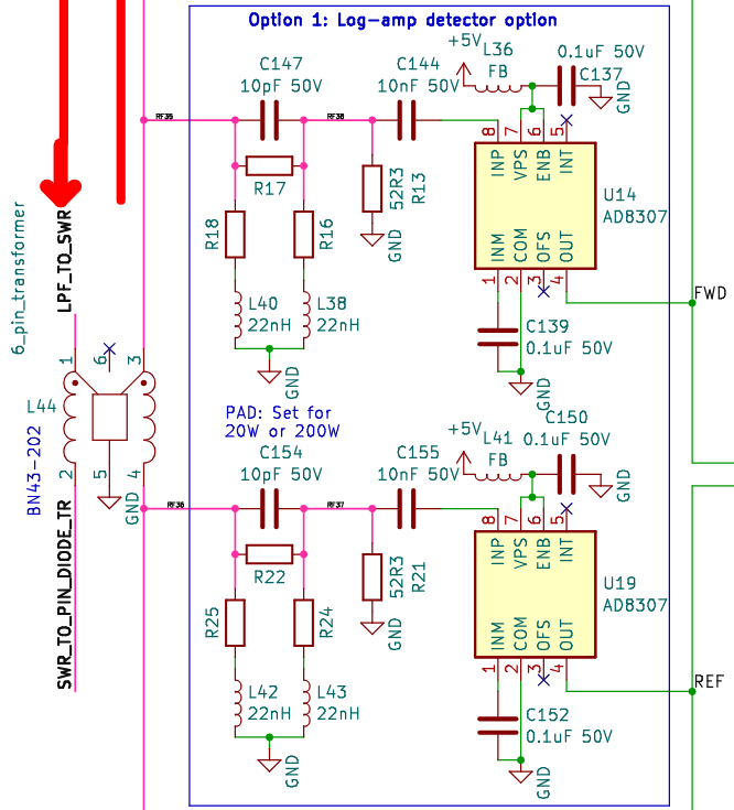 The LPF control board for the T41 contains a circuit that measures the forward power and the reverse power. This allows us to measure the power we’re transmitting, and to calculate the SWR on the transmission line. The relevant bit of circuitry is excerpted below: