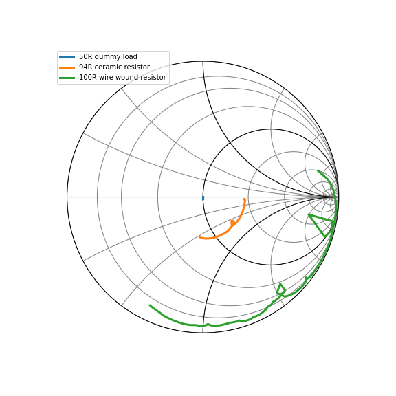 However, these are wirewound resistors, which means that, while they might be a resistor at DC, at HF frequencies they have a substantial inductance. This can be see on a Smith chart – the chart below compares a ~100 Ohm ceramic resistor to a wirewound resistor of the same DC resistance. The VNA swept from 1 to 60 MHz, and you can see that the impedance of the wirewound resistor is substantially higher than 100 Ohms over this whole range.