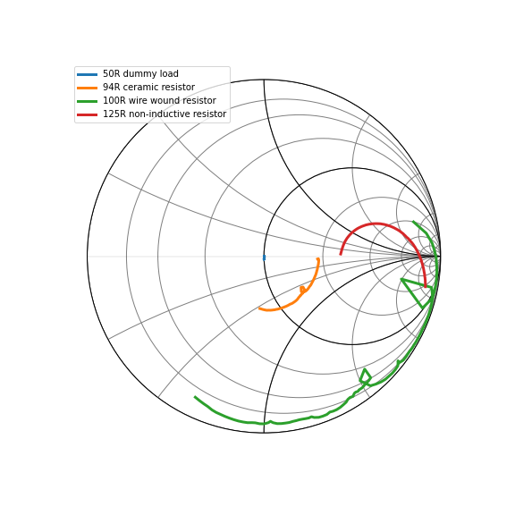 To make a dummy load capable of sinking many watts of power, you might think that you need to use non-inductive wirewound resistors. However, these might not deliver the expected performance. I bought some precision non-inductive wirewound resistors on Amazon and found that they did not behave like pure resistors. The Smith plot below shows that the 125 Ohm non-inductive resistor does not behave like a 125 Ohm resistor between 1 and 60 MHz.