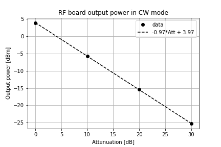 \[P_{\rm TX}[{\rm dBm}] = \frac{V_{\rm out} [{\rm mV}]}{25} - 84 + C [{\rm dB}]\]where \(C\) is the coupler + attenuator value of 46 dB (or whatever).